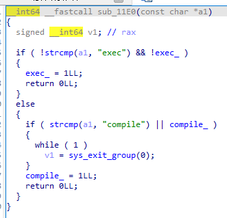중요하게 봐야할 부분은 3부분입니다. open_store에서는 sub_11E0()를 hook function으로 넣어줘서 compile, exec함수를 한번씩 사용하게 하게 필터링을 합니다. buy함수에서는 buy()함수를 한번만 사용할 수 있도록 해주며 item의 index를 입력받아 해당 주소에 0을 넣고 string으로 변환하여 return합니다.